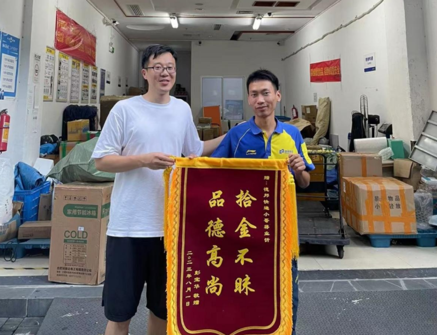 8月1日,失主彭先生、自媒体博主“笑三西”在社交平台上分享了自己“失而复得”的经过。当天下午,广东深圳泰美珠宝园内,彭先生刚从金库提取了5个100g的金条,返回途中没有意识到金条外包装破损,导致其中一个100g的金条不慎遗漏。幸运的是,深圳罗湖区水贝国际珠宝交易中心经营分部的德邦快递员蒋业忻无意中捡到了金条,并立即报警。在警方的帮助下,蒋业忻及时与彭先生取得联系,成功将金条归还。彭先生感慨万分,“真是万幸丢失的金条还能找回来。!”他原本想发红包表示感谢,却被蒋业忻谢绝了。8月2日,彭先生赠予蒋业忻一面锦旗表达谢意。
