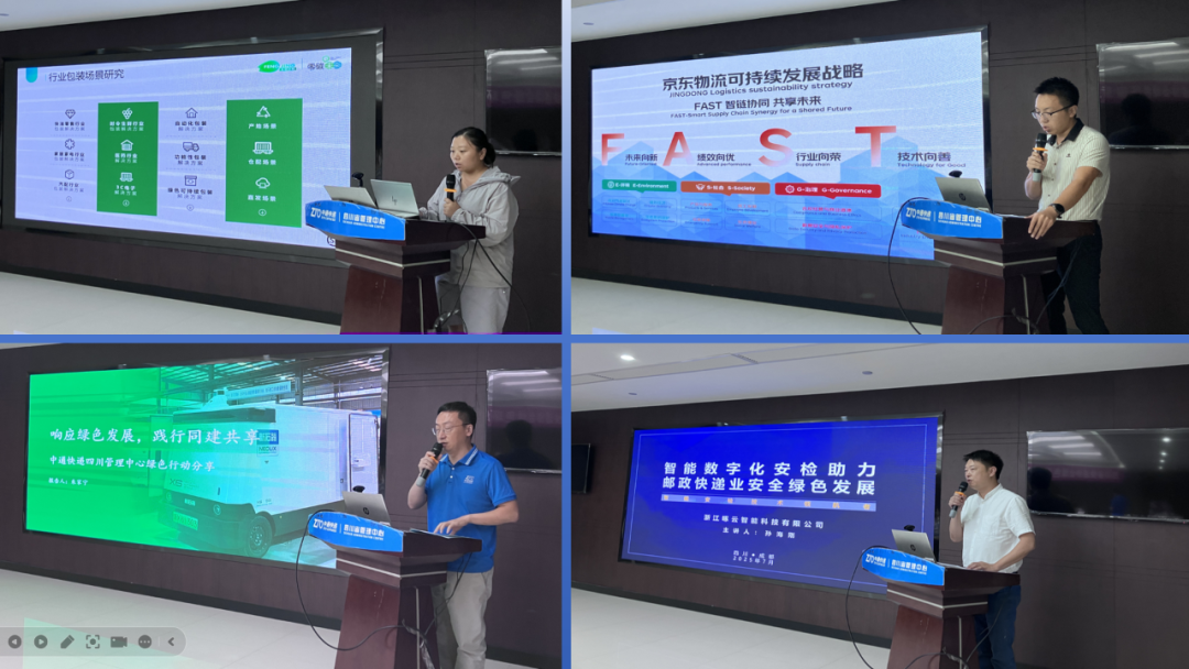 顺丰、京东、中通三家品牌快递企业,浙江啄云智能科技有限公司等关联企业分别就本企业落实降碳减排,助力四川快递业绿色发展方面所做的工作作了分享交流。各单位的分享内容各有侧重,亮点纷呈,对邮政快递企业推动绿色发展提供了借鉴,对全行业进一步做好绿色环保工作,助力行业高质量发展必将起到积极的促进作用。