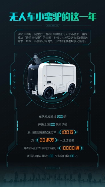 小蛮驴是阿里为“最后三公里”研发的自动驾驶产品,服务于快递、外卖、生鲜及各类即时配送需求。2020年9月问世后,达摩院与菜鸟合作,率先针对快递配送形成服务闭环,将高校、社区、园区的快递按用户预约时间送货到楼。